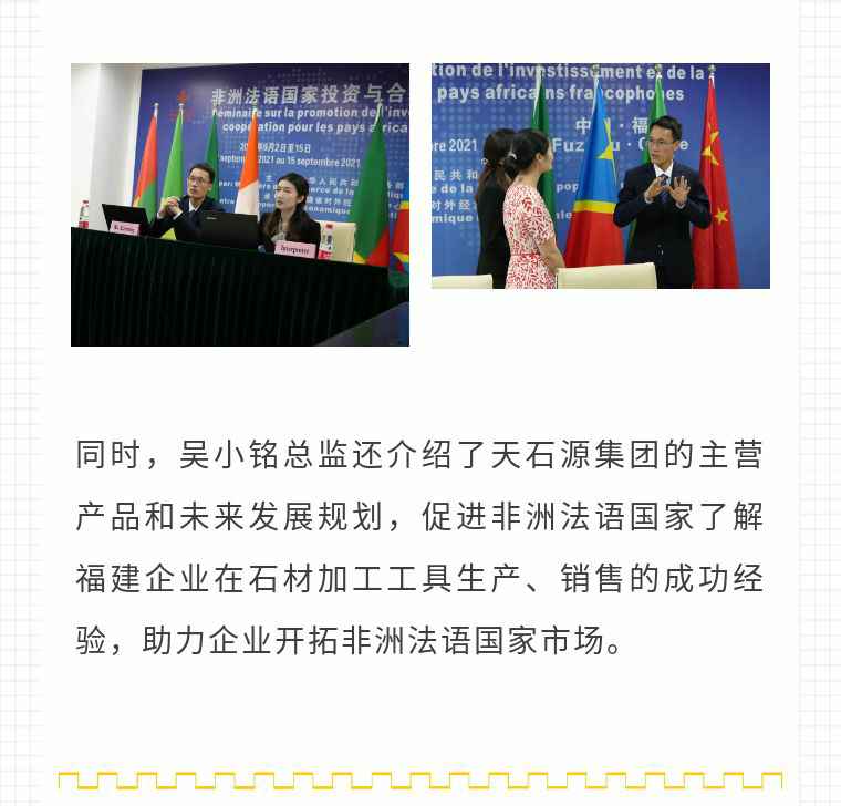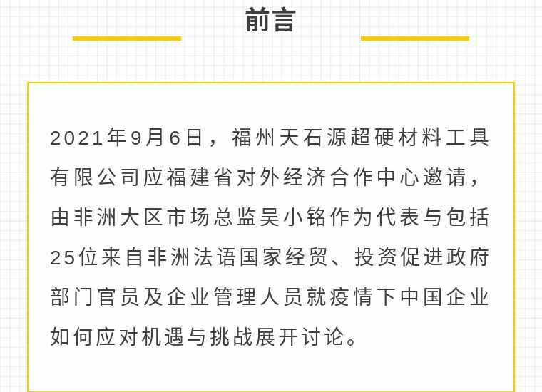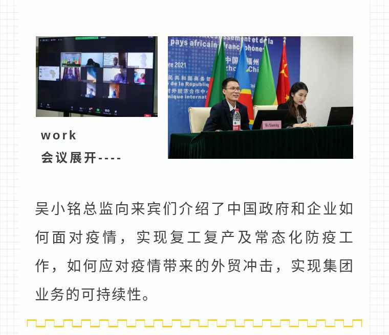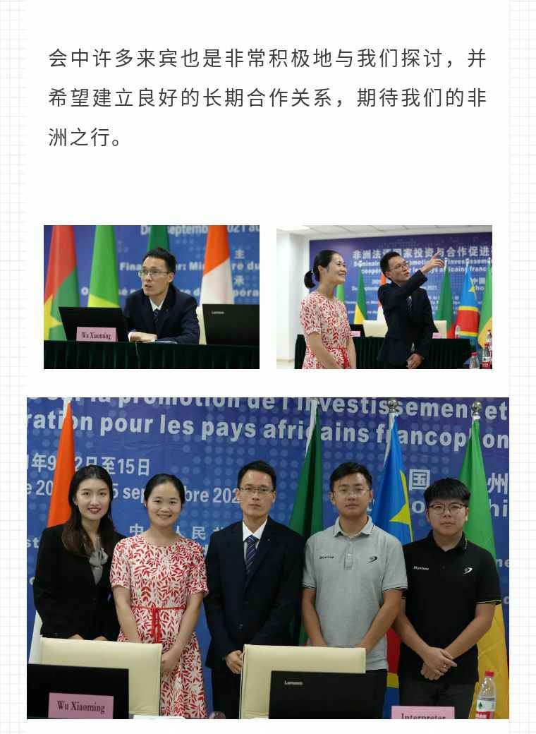 2021年9月6日,米兰网站登录入口-米兰(中国)应福建省对外经济合作中心邀请,由非洲大区市场总监吴小铭作为代表与包括25位来自非洲法语国家经贸、投资促进政府部门官员及企业管理人员就疫情下中国企业如何应对机遇与挑战展开讨论。